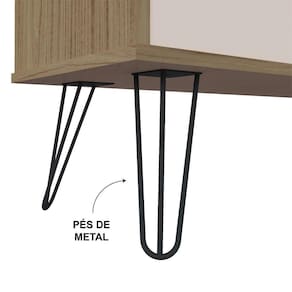 Características adicionais: Rack: Tampo em Tamburato de 50mm que suporta TVs até 65 polegadas, 2 passa fios, 4 portas com dobradiças metálicas, Amplo espaço para objeto e eletrônicos, 5 pés metálicos;