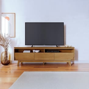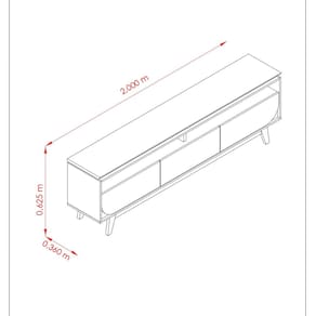 detalhe curvo, tampo da TV suspenso em 2,5cm com borda chanfrada, pés usinados, painéis