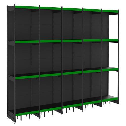 KIT GÔNDOLA RACK PAREDE OU LATERAL 202 FIT 1 INICIAL 4 CONTINUAÇÃO AMAPÁ 90X60 COR PRETO PORTA ETIQUETA VERDE