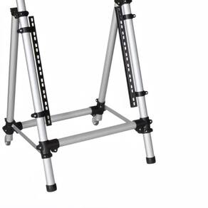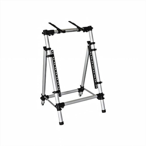 Rack tubular em alumínio para utilização com periféricos padrão rack 19", contando também com uma barra em Lna parte superior, podendo utilizarmesa de som, notebookou produto parecido.