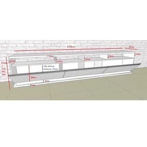 *Rack Reforçado para Tv Grande*Móveis resistente à agua através da tecnologia de colagem PUR; *Nossos produtos não são produzidos em série, são frutos da marcenaria moderna feitos um a um por profissionais experientes e com tecnologia de ponta;*Não produzimos móveis em pintura, aglomerado ou MDP, *Produzido 100% em MDF com laminado BP*Peça de reforço no meio para sustentar o peso de uma TV; *Basculante com pistão a gás para evitar o fechamento brusco da porta;*Puxador de perfil em alumínio;*Medidas*Largura: 270 cm; *Altura: 57 cm + 1 cm pé; *Profundidade: 35 cm; *Espessura: 1,5 cm;*Peso: 85 Kg;*Alta durabilidade;*Fácil limpeza;*Acompanha buchas, parafusos e suportes para montagem;*Enviado desmontado com instruções de montagem;*Embalagem resistente;