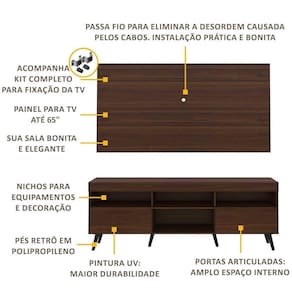 Para facilitar a sua vida, este produto acompanha também o kit para fixação da TV. Muito prático e de fácil instalação, pode ser utilizado para TVs LCD, LED e plasma de 14 a 71. Totalmente sobreposto, acompanha gabarito de montagem que auxilia na instalação. Conta com um sistema de encaixe rápido, possui 16mm de deslocamento que permite o ajuste do encaixe das peças. Os pés palito, estilo retrô, em polipropileno, dão um charme especial ao móvel deixando-o com um visual leve e permitindo você compor um ambiente com ar vintage e moderno ao mesmo tempo.