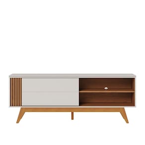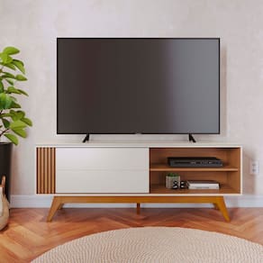 Características: Estrutura: MDP/MDF 1 Porta de Correr Tampo com detalhe chanfrado Detalhes Ripados Suporta TV até 65 Polegadas Peso suportado: 3 á 20kg Pés em madeira maciça