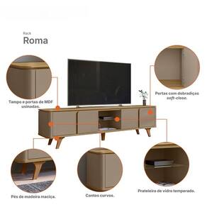 O Rack Roma 2.17 - Casa D Móveis é a melhor escolha para sua sala. Com design retro que irá encantar você. Ele possui tampo e base de MDF chanfrado em ângulo proporcionando ainda mais charme e requinte ao móvel. Seus pés são feitos de madeira maciça garantindo com isso ainda mais qualidade e resistência ao produto. Possui quatro portas com dobradiças metálicas e amplo espaço interno. Suporta TVs de até 70 polegadas e seus amplos nichos são ideais para acomodar aparelhos eletrônicos, objetos de decoração, entre outros.Dimensões do Produto Montado:Altura: 57,5cmLargura: 217cmProfundidade: 40cmObservações:– Ideal para Tvs até 70 Polegadas– Pés em madeira maciça– Prateleira de Vidro– Portas de MDF com detalhes arredondadosMarca: Casa DModelo: RomaReferência: 11097682WATENÇÃO: Não nos responsabilizamos pela montagem deste produto. Aconselhamos a contratação de um profissional.