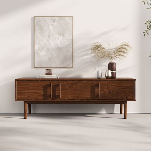 As três portas com puxadores verticais esculpidos na madeira criam uma frente contínua e elegante, enquanto os pés cônicos retos elevam o móvel com leveza e garantem estabilidade. A abertura com dobradiças metálicas e o interior amplo tornam o uso prático no dia a dia, seja para eletrônicos, objetos ou organização discreta.
