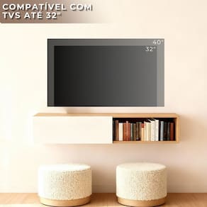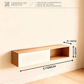 Rack Suspenso Tower 1260 para TV até 40”. MDF/MDP branco e amadeirado, estrutura reforçada, 1 porta basculante e nichos internos. Mede 126x20x22 cm. Suporta 30 kg. Enviado desmontado com manual e garantia 90 dias. Produto Montado: Sim Acabamento: BP Acabamento da Porta: BP Ambiente Principal: Sala de Estar codigo_ean: 7900288349583 Complexidade da Montagem: Média: pode ser montado por mais de uma pessoa e/ou necessite de maior conhecimento para montagem Cor: Branco/Cinamomo Cor da Porta: Branco Cor do Produto: Branco/Cinamomo Escala de Brilho: Fosco Escala de Brilho da Porta: Fosco Espessura do Tampo: 12 mm Ideal para TVs até (Polegadas): 40 Itens Inclusos: 1 Rack, Manual de Montagem e Kit Ferragens Linha ou Coleção: Tower 1260 Marca: BYHOUSE Material da Porta: MDF/MDP Material Principal: MDF/MDP Necessita Montagem: Sim Origem do Produto: Nacional Peso: 8 kg Possui Adega: Não Possui Espelho: Não Possui iluminação: Não Possui Passa Cabos: Sim Possui Pés: Suspenso Possui Prateleiras: Não Possui Vidro: Não Recomendações de Uso, Manutenção e Limpeza: Pano com água Sistema de Montagem: Acompanha manual Tipo de Porta: Abrir Tipo de Puxador da Porta: Externo Marca: Não Informado