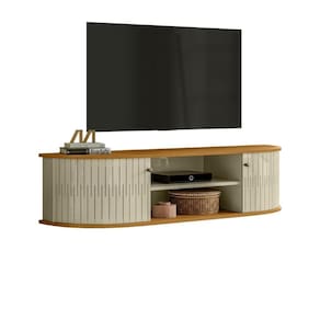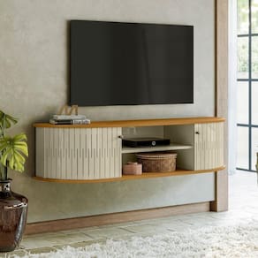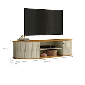 Em MDP de 15mm, Portas íveis em MDF, Tampo e base com detalhes curvos, Puxadores em poliestireno, Suporta TVs de até 60.