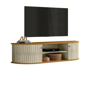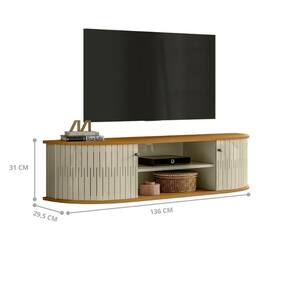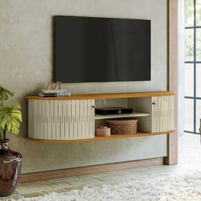 Em MDP de 15mm, Portas flexíveis em MDF, Tampo e base com detalhes curvos, Puxadores em poliestireno, Suporta TVs de até 60.