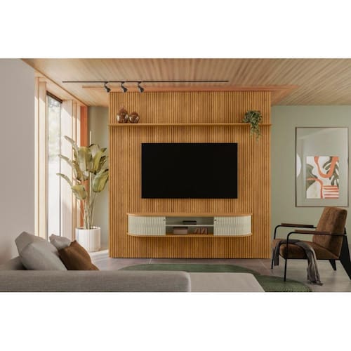 O Painel Piso-Teto Bugatti é a escolha perfeita para quem busca sofisticação e modernidade na sala de estar. Com dimensões imponentes de 2,08m de largura e 2,44m de altura, ele preenche sua parede do piso ao teto, suportando TVs de até 75 polegadas fixadas diretamente no painel frisado em MDF.
