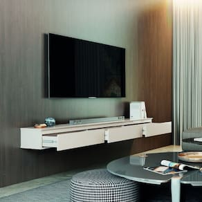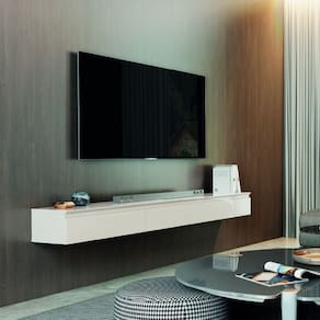 Eleve o estilo do seu espaço com o Rack Suspenso Aspen 1,80m, um acessório que combina elegância e funcionalidade em perfeita harmonia. Com três gavetas equipadas com corrediças telescópicas de deslizar suave e um tampo em MDF com bordas laqueadas, este rack oferece um espaço organizado e sofisticado para acomodar aparelhos eletrônicos e objetos decorativos. Garantindo um ambiente mais harmonioso, elegante e moderno, onde a organização e a praticidade se encontram com o estilo.