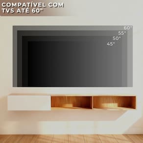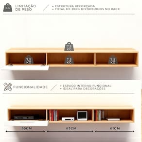 Compatível com TVs até 60”. Mede 184x20x22 cm e suporta até 30 kg distribuídos.