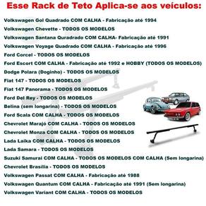 Rack teto universal gol voyage quadrado 45g 1 elastico corda :: atenção:: Compatível com os modelos: Universal para carros antigos com calha A vhip desenvolveu esse rack sob rigoroso controle de qualidade, cujo processo industrial, segue os padrões de segurança, com acompanhamento e supervisão técnica contínua, visando proporcionar ao consumidor, uma excelente alternativa no transporte de bagagens ou cargas. Especificação técnica: Projetado e desenvolvido para suportar até 45 kg de peso máximo, desde que distribuído de forma uniforme e equilibrada; Manual de instruções, para orientar a montagem, sua capacidade de transporte, regras de utilização e outros informes; Não amassa e nem risca o veículo; Cor preto; Fabricado em aço; Não exige furações; Fixação na calha; Fácil instalação; Ótimo acabamento; Excelente resistência. Especificações técnicas: Fixação na calha Não amassa nem risca o veículo Suporta até 45kg de carga Garras e suportes em ferro tubular Cor preto Contém 2 peças Conteúdo da embalagem: 2 racks dianteiro + traseiro ; Kit instalação; Manual. Aplica-se aos veículos: Volkswagen gol quadrado com calha - fabricação até 1994 Volkswagen chevette - todos os modelos Volkswagen santana quradrado com calha- fabricação até 1991 Volkswagen voyage quadrado com calha - fabricação até 1996 Ford corcel - todos os modelos Ford escort com calha - fabricação até 1992 e hobby todos os modelos Dodge polara doginho - todos os modelos Fiat 147 - todos os modelos Fiat 147 panorama - todos os modelos Ford del rey - todos os modelos Belina sem longarina - todos os modelos Ford scala com calha - todos os modelos Chevrolet marajó com calha - todos os modelos Chevrolet monza com calha - todos os modelos Lada laika com calha - todos os modelos Lada samara - todos os modelos Suzuki samurai com calha - todos os modelos com calha sem longarina Chevrolet brasília - todos os modelos Volkswagen passat com calha - fabricação até 1988 Volkswagen quantum com calha - fabricação até 1991 sem longarina Volkswagen variant com calha - todos os modelos