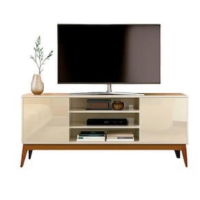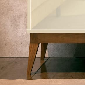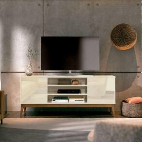 Com pintura UV, o móvel combina tons resultando em um visual moderno e versátil. Os pés em madeira maciça reforçam a estabilidade e completam o estilo retrô com charme e personalidade.