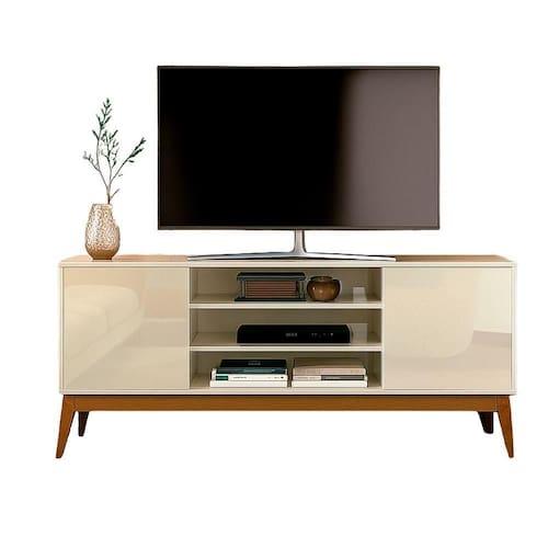 Sua estrutura ampla acomoda TVs de até 65 polegadas com total e ainda oferece três nichos centrais abertos, ideais para aparelhos eletrônicos e objetos decorativos. Nas laterais, duas portas articuladas garantem espaço reservado para armazenar itens diversos de forma organizada e discreta.