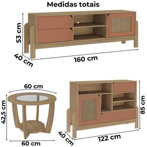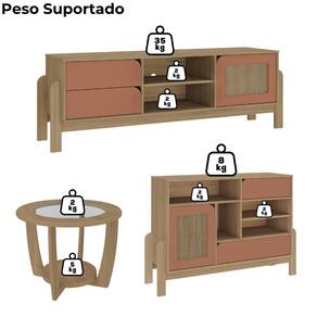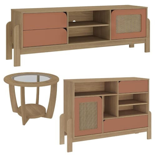 Rack Bancada, Buffet Aparador e Mesa de Centro, o conjunto versátil e moderno para sua sala de estar. Estruturas em MDF/MDP (15/25 mm) com acabamento em pintura UV texturizada. Rack e Buffet possuem gavetas com corrediças telescópicas, porta com dobradiça metálica e sistema de amortecimento, detalhe reversível na porta (acabamento liso ou pintura 3D imitando palha), além de nichos, passa-fios (no Rack) e pés curvos em MDF (25 mm). Já a mesa de centro 100% MDF, apresenta design arredondado, bordas boleadas e tampo em vidro temperado (5 mm). Rack suporta com segurança TVs de até 65 polegadas. Este conjunto será entregue em 03 volumes.