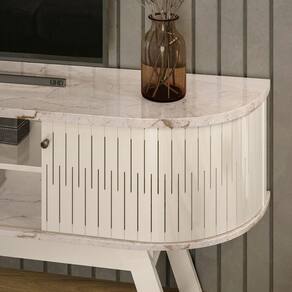 Rack Tv 75 Pol 183cm Bancada Para Sala Enzari M20 - D'rossi Cor Calacata E Off White O Rack Enzari é a escolha perfeita para quem busca design moderno, funcionalidade e sofisticação em um só móvel. Ideal para TVs de até 75 polegadas, possui 183 cm de largura e estrutura em MDP 15 e 25 mm, com acabamento em pintura DIP ( Inverse Printing), que oferece brilho intenso e alta resistência. O tampo e a base com detalhes curvos agregam requinte ao ambiente. Conta com duas portas deslizantes em MDF, que otimizam o espaço com praticidade e elegância, além de nichos abertos e uma prateleira interna para acomodar eletrônicos e objetos decorativos. Os puxadores cromados em poliestireno dão um toque de sofisticação, enquanto o passa-fios integrado facilita a organização dos cabos. Ideal para transformar sua sala em um ambiente contemporâneo e organizado, suportando até 50 kg distribuídos. Dimensões do Produto: Altura: 69 cm Largura: 183 cm Profundidade: 38 cm Peso: 30 kg Especificações do Produto: Material da Estrutura: MDP 15mm/ 25mm Acabamento: Pintura DIP ( Inverse Printing). Escala de Brilho: Brilho Peso Suportado: 50 kg distribuídos Suporta TV de até: 75 Polegadas Possui Portas: Sim Quantidades de Portas: 2 Portas Tipo de Portas: Deslizante Tipo de Puxadores: Poliestireno Cromado Possui Gavetas: Não Possui Nichos: Sim Quantidade de Nichos: 2 Nichos Possui Espelho: Não Possui Prateleiras: Sim Quantidade de Prateleiras: 1 Prateleira Possui Pés: Sim Possui Rodízios: Não Possui Passa Fios: Sim Diferenciais: Design moderno; Portas deslizantes íveis em MDF; Tampo e base com detalhes curvos. Sistema de Montagem: Girofix, Parafusos Manual de Montagem: Sim Complexidade da Montagem: Média Montagem: Recomendamos que seja feita por um Garantia: 90 dias contra de fabricação Instruções de Limpeza: Utilizar um pano limpo e levemente úmido Quantidade de Volumes 1 Caixa Medida das Embalagens Caixa 1: 187,7x40,2x11,7cm : É feita somente até o térreo ou portaria. Confira sempre as medidas das embalagens para assegurar que o produto passe por portas e escadas do .
