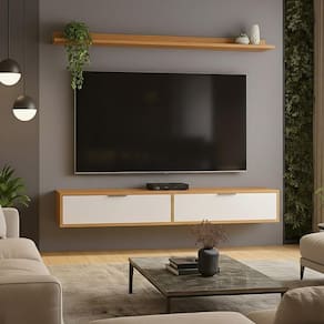O conjunto acompanha uma prateleira decorativa, que instalada acima do televisor, cria uma composição completa e harmônica, deixando sua Sala ainda mais sofisticado.