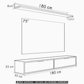 Características do Produto Material da Estrutura: MDP. Espessura das Chapas: 15mm/25mm. Peso Suportado Distribuídos: Rack: 15 Kg/Prateleira: 8 Kg. Acabamento: Pintura UV. Escala de Brilho: Brilho/Fosco. Suporta TV de até: 75 Polegadas. Possui Porta: Sim. Quantidade de Portas: 2 Portas. Tipo de Portas: Basculante. Tipo das Dobradiças: Metálicas. Possui Puxador: Sim. Material dos Puxadores: Poliestireno. Possui Prateleira: Sim. Quantidade de Prateleiras: 1 Prateleira. Possui Passa-Fios: Não. Possui Pés: Não. Diferenciais: - Design moderno. - Estrutura 100% MDP. - Prateleira em MDP 25mm. - Porta com dobradiças metálicas. - Pré-marcação para furo passa-fio. Sistema de Montagem: Cavilhas/Parafusos/Minifix/Pregos. Manual de Montagem: Sim. Complexidade da Montagem: Médio. Volumes: 1 Volume. Conteúdo da Embalagem: 1 Rack Suspenso. Garantia do Fabricante: 90 dias contra de fabricação. Montagem: Recomendamos que seja feita por um . Recomendação de Limpeza: Utilize pano úmido.