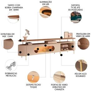 Projetada para suportar televisores de até 85 polegadas, a Bancada Para TV conta com cantos arredondados e portas com vidro embutido em caneleta, conferindo um visual moderno e elegante.