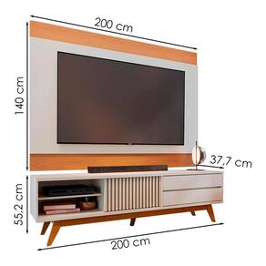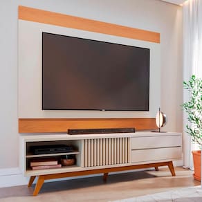 Rack Veneza e Painel Nilo combinam estilo contemporâneo e funcionalidade para transformar sua sala. Produzidos em MDP/MDF (15/25 mm), com acabamento em pintura UV texturizada. Composto por porta de correr com detalhes ripados (alto relevo), gavetas com corrediças telescópicas, prateleira, passa fios embutidos, tampo em MDF (25 mm) e pés em madeira maciça (Pinus 20 cm) com travas. Painel suporta TVs de até 75 polegadas (Rack TVs de 75 polegadas) com segurança. Este conjunto chegará em sua casa separado em 3 volumes.