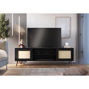 O Rack Viena 160cm - Preto tem sua estrutura fabricada em MDF BP 15mm, portas com palhas sintéticas, furo passa fios e pés em madeira natural. Possui sapata com feltro nos pés, evitando assim, riscar o chão. Perfeito para você que procura modernidade com um toque clean.