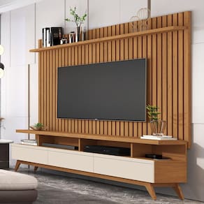 O Rack Vivare Wodd c/ painel ripado real é um móvel de durabilidade e grande beleza. Produzido em MDP, produto com alta resistência e design diferenciado, sendo um móvel firme e sofisticado. Possui acabamento U.V. amadeirado Touch, proporcionando auto relevo e beleza. Possui ainda pés de madeira maciça, 3 gavetas com corrediça telescópicas e 1 prateleira. O móvel que tornará sua sala mais aconchegante e sofisticada. Produto Montado: Sim Acabamento: Impressão Acabamento da Gaveta: Impressão Acabamento da Prateleira: Impressão Acompanha Manual de Instalação: Sim Altura do Painel: 135 cm Altura do Rack: 62 cm Altura dos Pés: 20 cm Altura Máxima dos Pés: 20.0000 Ambiente Principal: Sala de Estar codigo_ean: 7909903345092 Complexidade da Montagem: Alta: deve ser montado por um montador especializado Cor: Marrom/Off White Cor do Produto: Marrom/Off White Escala de Brilho: Semi-Brilho Escala de Brilho da Gaveta: Semi-Brilho Escala de Brilho da Prateleira: Semi-Brilho Espessura do Painel: 20,5 cm Gaveta com Chave: Não Ideal para TVs até (Polegadas): 72 Itens Inclusos: 1 Painel, 1 Rack, Manual de Montagem e Kit Ferragens Largura do Painel: 185,5 cm Largura do Rack: 180 cm Manual de Montagem e Instalação: https://product-hub-prd.madeiramadeira.com.br/856050/documents/2d465602-db89-43ad-bc06-dcca0547c2a98painelclassicripado135x18.pdf Material da Gaveta: MDP Material da Prateleira: MDP Material dos Pés: Madeira Maciça Material Principal: MDF/MDP Necessita Montagem: Sim Origem do Produto: Nacional Peso do Painel: 42,2 kg Peso do Rack: 45,7 kg Peso Máximo por Gaveta: 5 kg Peso Máximo por Prateleira: 5 kg Possui Espelho: Não Possui iluminação: Não Possui Pés: 04 Possui Portas: Não Possui Tomada: Não Profundidade do Painel: 20.5000 Profundidade do Rack: 40 cm Recomendações de Uso, Manutenção e Limpeza: Limpe com pano levemente umedecido em água. Nunca utilize produto químico. Sapatas Niveladoras: Não Sistema de Montagem: Parafusos, Cavilhas e Girofix. Suporte de TV Universal Incluso: Não Tipo de Corrediça da Gaveta: Metálica Telescópica Tipo de Dobradiça/Corrediça da Porta: Metálica Tipo de Madeira Maciça dos Pés: Eucalipto Tipo de Puxador da Gaveta: Embutido Marca: Giga Móveis