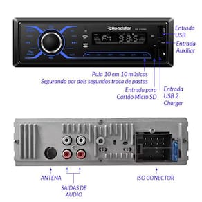 O auto rádio RS-2720BR possui entrada frontal auxiliar, entrada frontal para cartão micro SD, 2 entradas frontais USB (uma de energia e outra player), conexão Bluetooth, 4 saídas RCA e saída com conector ISO.