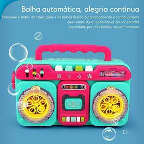 Características Brinquedo infantil com bolhas automáticas, música e luzes coloridas Design portátil, leve e fácil de transportar Inspirado em rádio vintage, visual encantador para crianças Sistema à prova de vazamentos para brincar sem bagunça Seguro e não tóxico, ideal para crianças acima de 3 anos Perfeito para festas, encontros e brincadeiras ao ar livre
