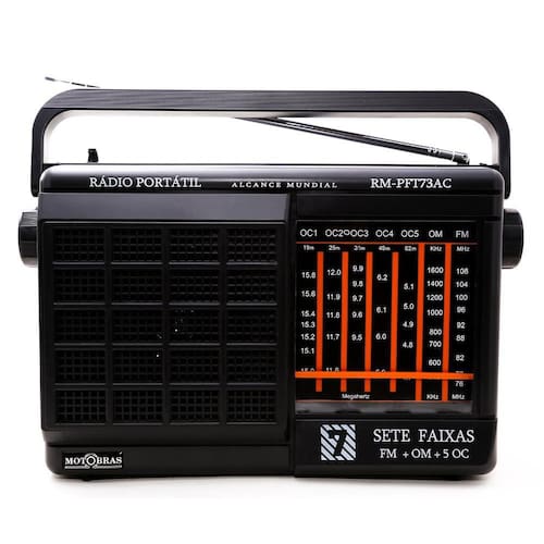 O rádio Motobras PFT73AC é uma excelente escolha de compra para você que gosta de ouvir suas músicas e estações de rádio com alta qualidade e fidelidade sonora. Seu visual retrô agrega charme para o aparelho, sem deixar de lado a qualidade dos produtos Motobras. Ele conta com 7 faixas de frequência: FM, OM, OC5, OC4, OC3, OC2 e OC1, que podem ser controlados através de uma chave localizada na parte traseira do produto. Este rádio Motobras 7 faixas possui potência de saída de 1000W RMS. As Ondas Curtas (OC) possibilita, em determinados horários, sintonizar emissoras de outros países. Este rádio simples é portátil e fácil de transportar, pois conta com uma alça na parte superior. Você pode também conectar seu fone de ouvido, para que tenha mais privacidade para curtir suas músicas preferidas. Outro ponto que vale a pena destacar, é que ele funciona por alimentação na tomada ou à pilha.