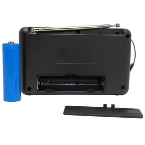 Possui sintonizador de rádio AM/FM, com antena retrátil para melhor recepção. O modelo funciona com bateria recarregável inclusa , oferecendo flexibilidade de uso em qualquer situação.