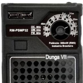 Rádio Portátil RM-PSMP32 Preto MOTOBRAS É um digital, sintonia mecânica, microprocessado, com ótima sensibilidade e controle automático de frequência AFC para maior estabilidade na ção. Possui Antena Telescopica para uma melhor condição de ção. Cor:preto Potência:300mw RMS Dimensões:133,5 x 74,0 x 33,5mm A x L x P Peso:0,220 kg sem pilhas Pesquisa:rm-psmpradiomotobras Faixas de Frequências: FM........................76 a 108 MHz OM......................520 a 1710 Khz OC......................5,80 a 12,10 MHz Alimentação: 4 pilhas pequenas tipo AA de 1,5 V não fornecidas ou fonte de alimentação 6 VDC não fornecida . Temperatura de Operação: 0 a 50ºC Consumo de Corrente: Mínimo de 30 mA; Máximo de 110 mA Tomada para fone de ouvido: Tipo estéreo que aciona os dois canais dos fones estereofônicos. Tomada para Eliminador de Pilhas : Na parte traseira possui uma tomada para eliminador de pilhas. Conecte o plug do Eliminador de Pilhas de 6 VDC e 250 mA. Homologação Anatel: 060792000160 Marca: Não Informado