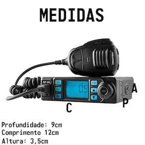 Especificações: - Frequência: 26.965 A 27.855 Mhz - Canais: 80 Canais - Potência De Transmissão: 3w E 6w Ajustável - Tensão De Alimentação: 13,8v - Impedância: 50 Ohms - Conector: Uhf, So-239 - Modulação: Am/Fm - Microfone: Eletreto Com Conector Rj45 - Código de Homologação Anatel: 13662-21-02250 - Peso do Produto: 675 gramas - Medidas: Altura: 3,5cm Comprimento: 12cm Profundidade: 9cm