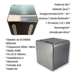 Radio Relogio Lelong Le-673 Usb/fm/bluetooth O Rádio Relógio Digital , possui Painel Moderno com frente espelhada dando um requinte ao ambiente. Feito de material ABS de alta qualidade além de marcar as horas, possui despertador.LED e números grandes facilitam a visualização das horas no display.Possui entrada Micro SD, FM, Bluetooth podendo assim escutar suas músicas preferidasPossui botões de fácil acesso e identificação das funções.Resposta de frequência 100Hz 18HzRádio 60dbFM87.5 - 108MhzSaída 5WBateria: DC 5V/18650 1200mAhItens Inclusos:1 Cabo P21 Cabo Usb1 Manual de instruções. Homologação Anatel: 003022112961 Marca: Não Informado