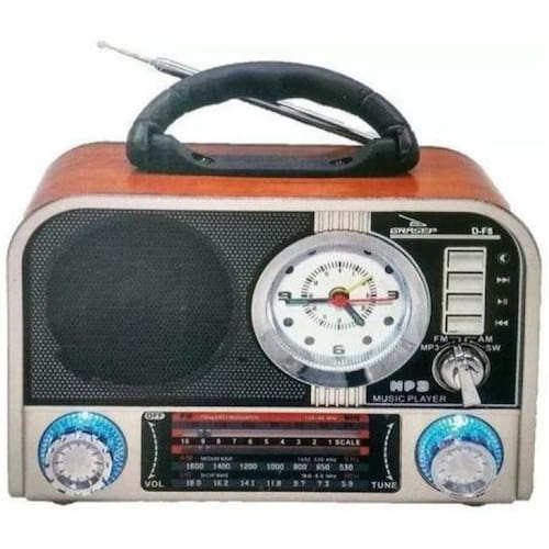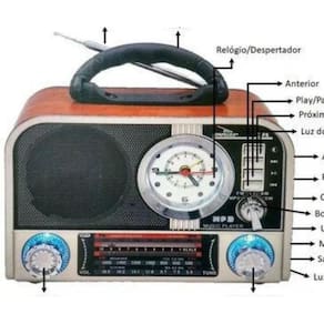 - Desing Simples - Conexão Bluetooth - Leve para onde quiser - Rádio multimídia - Bateria recarregável - Tomada 110/220 V - Antena embutida - AM/FM/SW -cartão SD Card - USB -entrada AUX -relógio Analógico