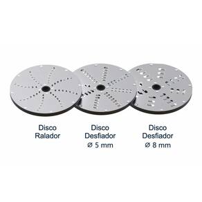 Bocal em aço inox e desmontagem rápida, garantindo praticidade; Tampa móvel que pressiona o alimento contra o disco; - Acompanha 3 discos: 1 ralador, 1 desfiador 5 mm e 1 desfiador 8 mm, discos RDA base em plástico ABS.