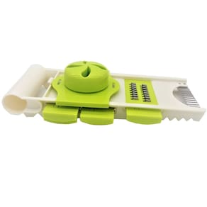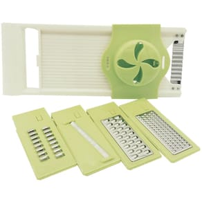 Prático ralador e fatiador do tipo mandoline conta com 4 lâminas, em aço inox, intercambiáveis para diferentes tipos de corte, tanto para fatiar quanto para ralar, sendo: 01 Lamina para fatiar, 01 Lamina de ralador fino, 01 Lamina de ralador grosso, 01 Lamina de corte palito, A parte inferior do Cortador de Legumes é ideal para corte ondulado.