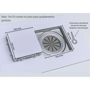 Ralo quadrado oculto 15cm x 15 cm inox304Ideal para banheiros, terraço, duchas, cozinha industrial, áreas externas e internas.Obs: o ralo não e sifonado deve ser ligado direto a uma caixa sifonada ou a tubulação de 100mm ou 150 mm, ligada na caixa sifonada.Acompanha:1- telinha de proteção para evitar a passagem de insetos2- uma chavinha para retirada da tampa.Base de 16cm x 16cm com aba de 1cm de cada ladoAltura de 2,8cm da base até o nível acabado do pisoDa base até o nível acabado do pisoInstruções para instalação2- o ralo possui saída com encaixe tubo 100mm e 150mm3- suporte interno de 10x10O produto é fabricado em inox 304 Marca: M1nox