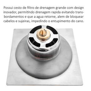 Possui cesto de filtro de drenagem grande com design inovador, permitindo drenagem rápida evitando transbordamentos e que a agua retorne, além de bloquear cabelos e sujeiras impedindo o entupimento do cano. O ralo é removível do prato de acabamento, facilitando a limpeza, basta girar ralo para desencaixar e girar novamente para encaixar de volta.