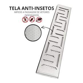 O conjunto Grelha Pluvial 10 cm x 50 cm é formado por: 01 Grelha modelo Inox 304 01 Suporte Porta Grelha (aro) em Inox 304 01 Tela Anti Insetos em Alumínio