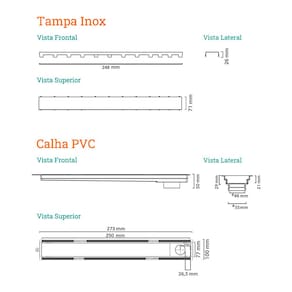- Dimensões AxLxP (mm): - Calha: 29x273x100; Tampa: 26x248x71 - Cor: Inox Polido - Material: Calha em PVC e Tampa em Inox 430 - Garantia: 5 anos junto ao fabricante - Referência: 2936 - Formato: Linear - Compatibilidade: Acoplável em caixas sifonadas de 100mm e de 150mm e compatível com tubo de 50mm (necessário o uso da bolsa acoplável da marca Novii - não incluso) - Fecha Ralo: Sim (previne o retorno de insetos pela tubulação) - Grade Retentora: Sim (previne entupimentos na tubulação de esgoto) - Abas para prevenir infiltrações: Sim - Sugestão de Uso: Ideal para salas de banho e banheiros em geral. - Base com altura reduzida: Permite a instalação apenas no contrapiso, sem precisar cortar a laje - Queda Interna: Sim (ajuda a água fluir naturalmente para saída do ralo) - Tipo: Seco - Local de Uso: Interno O que vem na caixa: 1 Base do ralo de PVC 1 Tampa de Aço inox 430 removível 1 Fecha Ralo 1 Grade Retentora