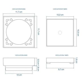 1 - Base 11,7 cm x 11,7 cm x 4,5 cm . 2 - Suporte para o revestimento 10,2 cm x 10,2 cm x 1,6 cm . 3 - Tela anti insetos/resíduos
