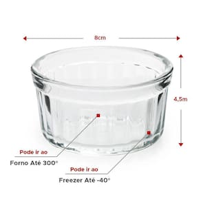 Ramekin de Vidro Ramequi para Forno e Freezer 140ml 6 Peças Ramekin de vidro especial, esse vidro pode ir ao forno em temperaturas de até 300 graus, também pode ser levado ao freezer em temperatura negativa de até -40 graus, dessa forma pode ser utilizado para pequenas entradas quentes como escondidinhos e também para pequenas sobremesas geladas, possui capacidade para até 140ml. PRINCIPAIS DESTAQUES: - Pode ser utilizado no forno, freezer, micro-ondas e lava louças- Kit com 6 unidades- Capacidade 140ml- Ideal para servir pequenas porções quentes, geladas e também como molheira.- Vidro especial (temperaturas de até 300 graus e negativas de até -40 graus)- Dimensões 8 x 4,5 cm (largura x altura)