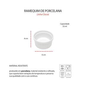 Contem:1 Ramequim Medidas: 6 x 4 cm Capacidade: 55 ml Material: Porcelana