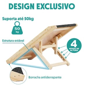 A rampa pet de madeira maciça com 4 níveis de altura é um equipamento projetado para auxiliar os animais de estimação a subir em locais mais elevados, como camas, sofás ou cadeiras, de forma segura e confortável. A madeira maciça é um material durável e resistente, capaz de suportar o peso do animal.