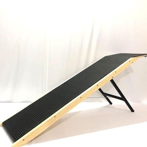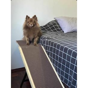 Este modelo possui patamar. O patamar é removível.Tapete emborrachado e antiderrapante muito macio. Disponível nas cores preto, cinza, azul marinho e marrom.Acompanha antiderrapante para os pés da rampa, não escorrega independe do piso.Recomendada para até 15kg.Não acompanha manual de montagem. Produto de fácil montagem.Sem verniz. Pés da rampa dobráveis e produto fácil de guardar.Não pintamos a rampa e não fazemos o uso de nenhum produto químico.Madeira pinus e pé de base da rampa em metal.Regula a altura de 45 à 75cm. Marca: Rampets