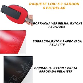 A Raquete Tenis De Loki RXTON 5.0 Star Carbon possui borrachas lisas aprovada pela federação chinesa de tênis de mesa e esponja 4mm, de ambos lados sendo uma vermelha e extremamente pegajosa e do outro lado preta mais lisa, sua lamina de madeira é composta com 7 laminas sendo (1a em madeira Wengé, 2a em madeira Ayous, 3a em fibra de carbono, 4a o miolo em madeira Candlenut, 5a fibra de carbono, 6a em madeira Ayous e a 7a em madeira Wengé) seu cabo estilo clássico com formato anatômico e oco com balanço interno. O que a torna profissional com extremo controle e com um potencial de contra ataque incrível. Suas borrachas são RXTON aprovada pela federação internacional de tênis de mesa. Indicada para jogadores exigentes, com um ótimo custo benefício. Acompanha uma capa protetora Material: Borracha, Madeira, Esponja e Pvc Marca: Loki Garantia: 01 mês após a compra, somente contra defeito de fabricação