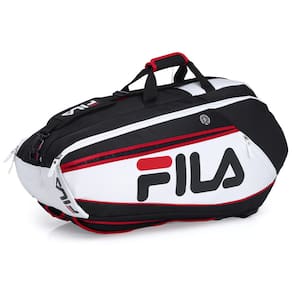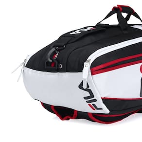 - Detalhamento: Um compartimento com fechamento em zíper que comporta até 6 raquetes sem capa, um compartimento térmico, bolso para armazenar roupa molha e/ou calçados, um bolso externo em cada lateral com fechamento em zíper, alça regulável, escrita Fila nas laterais;