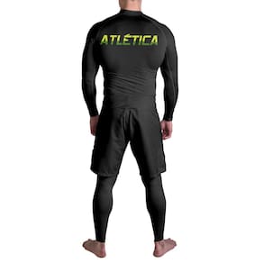 Rash Guard Masculina Atlética Esta Rash Guard é produzida com Supplex, que oferece aos nossos clientes a sensação do algodão com os benefícios da tecnologia de fibra avançada. Todo tecido utilizado nas Rash Guard pela Atlética Esportes é de alta tecnologia, próprio para melhorar o desempenho na prática esportiva. Composição: Rash Guard é confeccionada em Suplex de Poliester: 91,7% Poliester / 8,3% Elastano. Medidas aproximadas que essa Rash Guard veste: P - Largura: 45cm - Altura: 67 cm M - Largura: 46,5cm - Altura: 69 cm G - Largura: 48cm - Altura: 71 cm GG - Largura: 50cm - Altura: 73 cm Seus principais atributos na prática de atividades físicas são: - Adere totalmente ao corpo com equilibrada compressão, atributos necessários na prevenção de câimbras e distensões musculares; - Proporciona conforto, liberdade de movimentos e resistência; - Não cria odores de transpiração; - Mantém a temperatura corporal; - Não perde a cor nas lavagens; - Possui proteção contra raios UV; Nossas Rash Guard proporcionam maior velocidade de secagem, maior conforto térmico, ou seja, rápida transferência do calor e umidade do corpo para o ambiente através do tecido. Dicas de Cuidado: - A roupa suja não deve ser acumulada por muito tempo, devendo ser mantida seca e longe da luz solar e em local fresco e arejado (nunca deixar embalada em sacos plasticos). - Separar as cores claras e escuras. - Usar sabões neutros, utilizando sempre a quantidade indicada pelo fabricante (o sabão deve ter na embalagem a garantia de que é específico para artigos delicados). - Não deixe molhado, não torça e não guarde molhado.