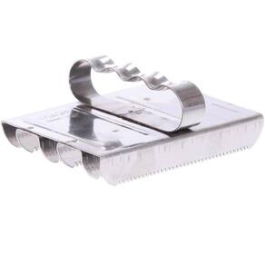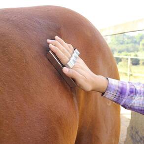 Raspadeira Vinagre fabricada em metal de alta resistência com serrilhas e alça para melhor manuseio, ideal para escovação dos animais e retirada de excesso de pelos.