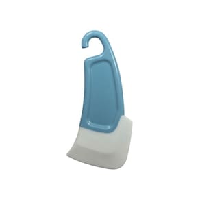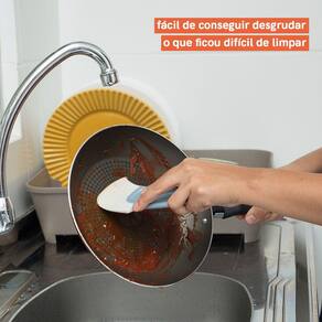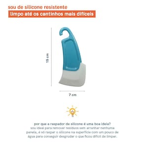 Esse é o raspador para limpeza da OIKOS. Esse aqui remove resíduos sem arranhar nenhuma panela! Sabe aquele ovo mexido feito de manhã e esquecido na frigideira em cima da pia? É só raspar o silicone na superfície com um pouco de água para conseguir desgrudar o que ficou difícil de limpar. Um lado é de silicone mais resistente, para raspagens mais fortes. O outro, mais mole e fino, o que ajuda a limpar os cantinhos mais difíceis.